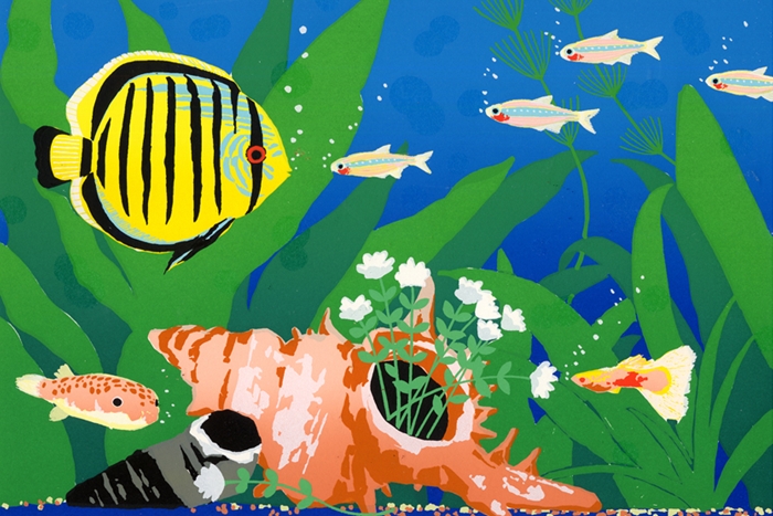 絵画 ジーグレー版画 吉岡浩太郎 楽しいイメージ 「貝と魚」 インチ:絵画シート+マット