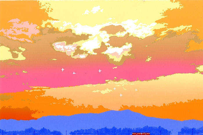 インクジェットプリンター印刷とお考え下さい。さらに吉岡浩太郎版画はプリントされたものにシルクスクリーン版画の技術をかさね、より色の深みが出るように画面処理がされています。