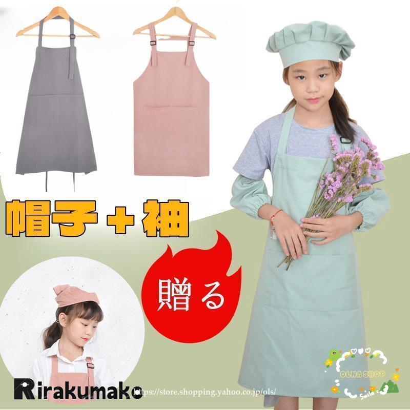 エプロン キッズ 小学生 三角巾 帽子 袖セット 子供 女の子 男の子 大人 無地 シンプル H型 首かけガーデニング 幼稚園 100cm~160cm
