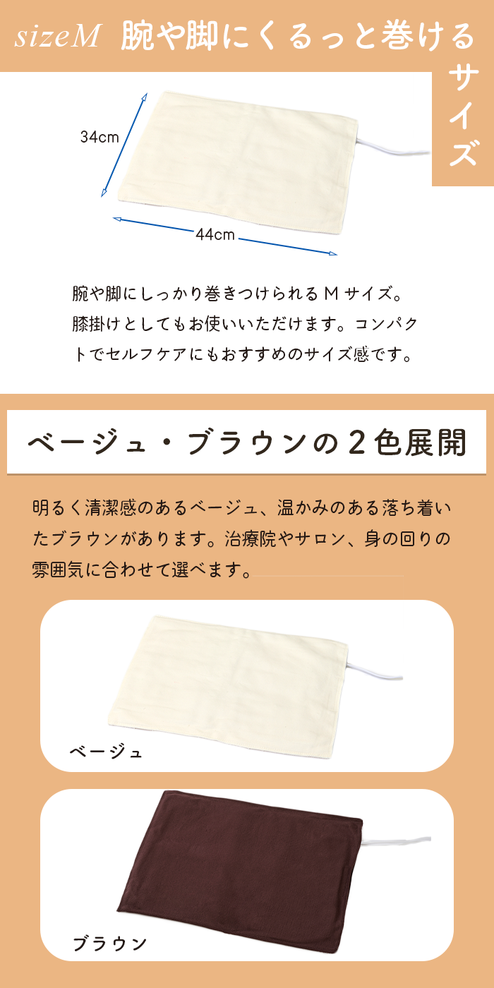 腕や脚にしっかり巻きつけられるMサイズ。膝掛けとしてもお使いいただけます。