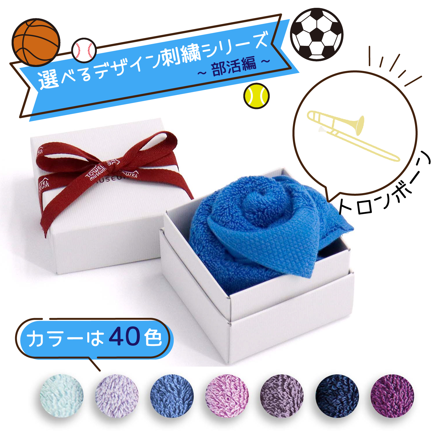 楽器 名入れ 刺繍 タオル 40色ハンカチ フラワーボックス ブルー系 部活編 トロンボーン ギフト プレゼント お祝い 贈り物 タオル美術館 公式 記念品 クリスマス