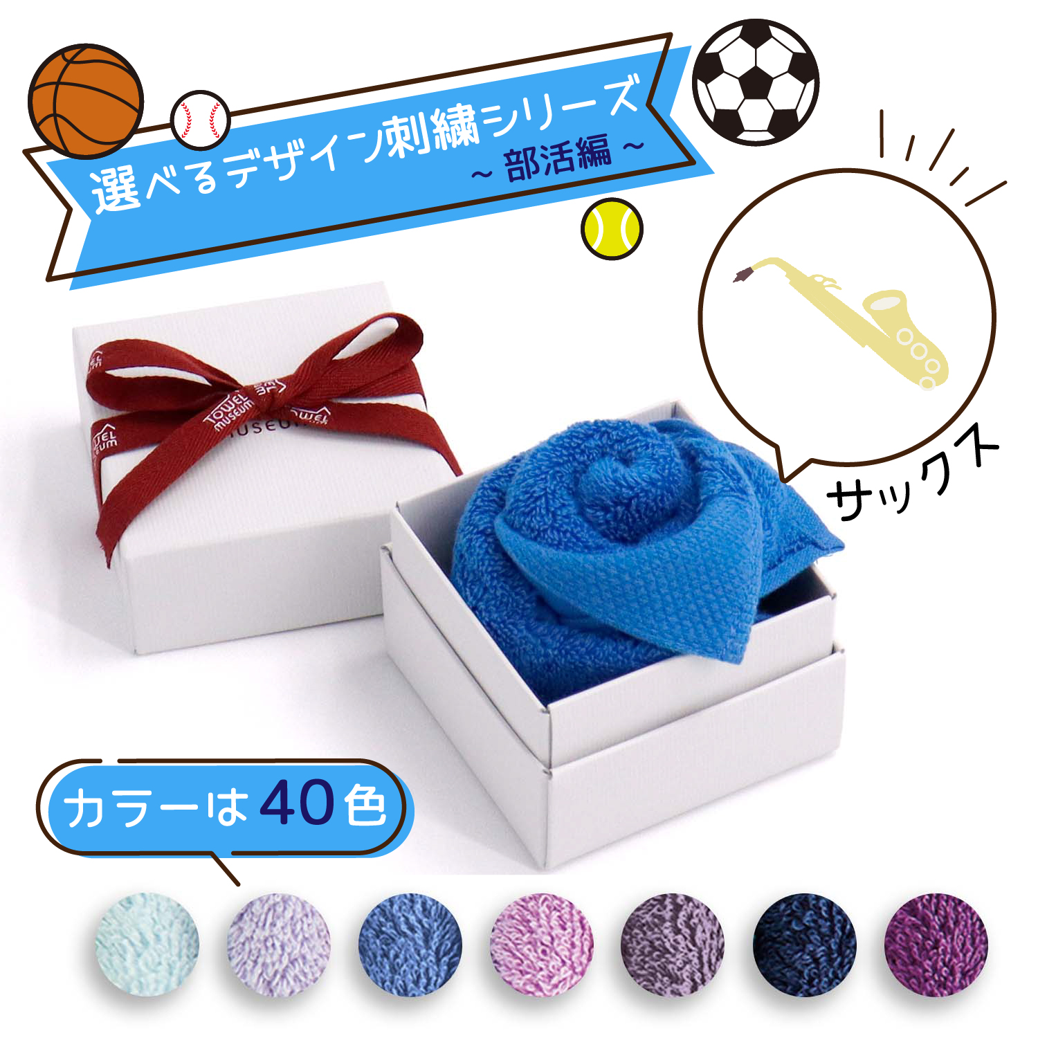 楽器 名入れ 刺繍 タオル 40色ハンカチ フラワーボックス ブルー系 部活編 サックス ギフト プレゼント お祝い 贈り物 タオル美術館 公式 記念品 クリスマス