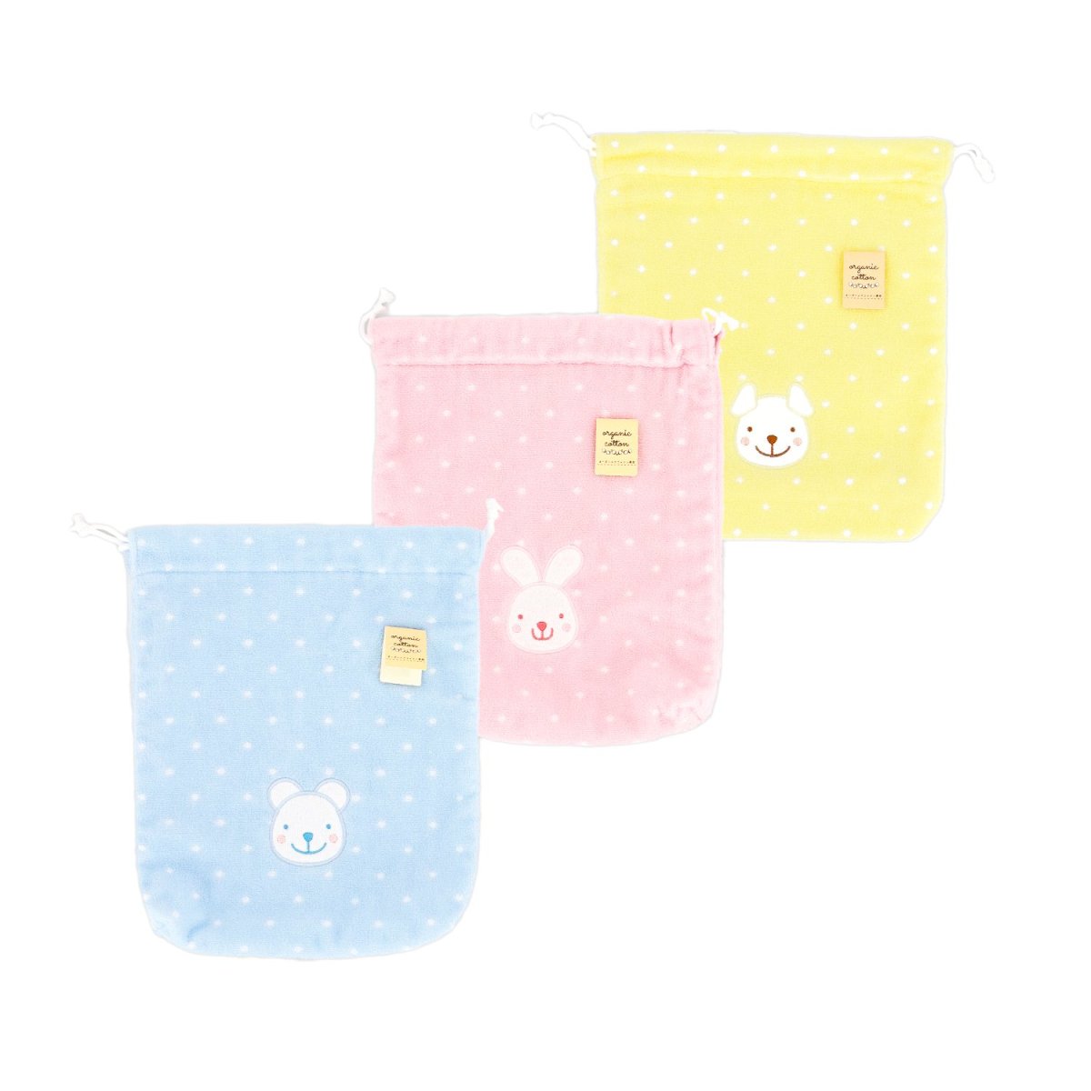 動物たちのにっこり顔がキュートな巾着袋。シリーズでそろえたくなる可愛さです。
