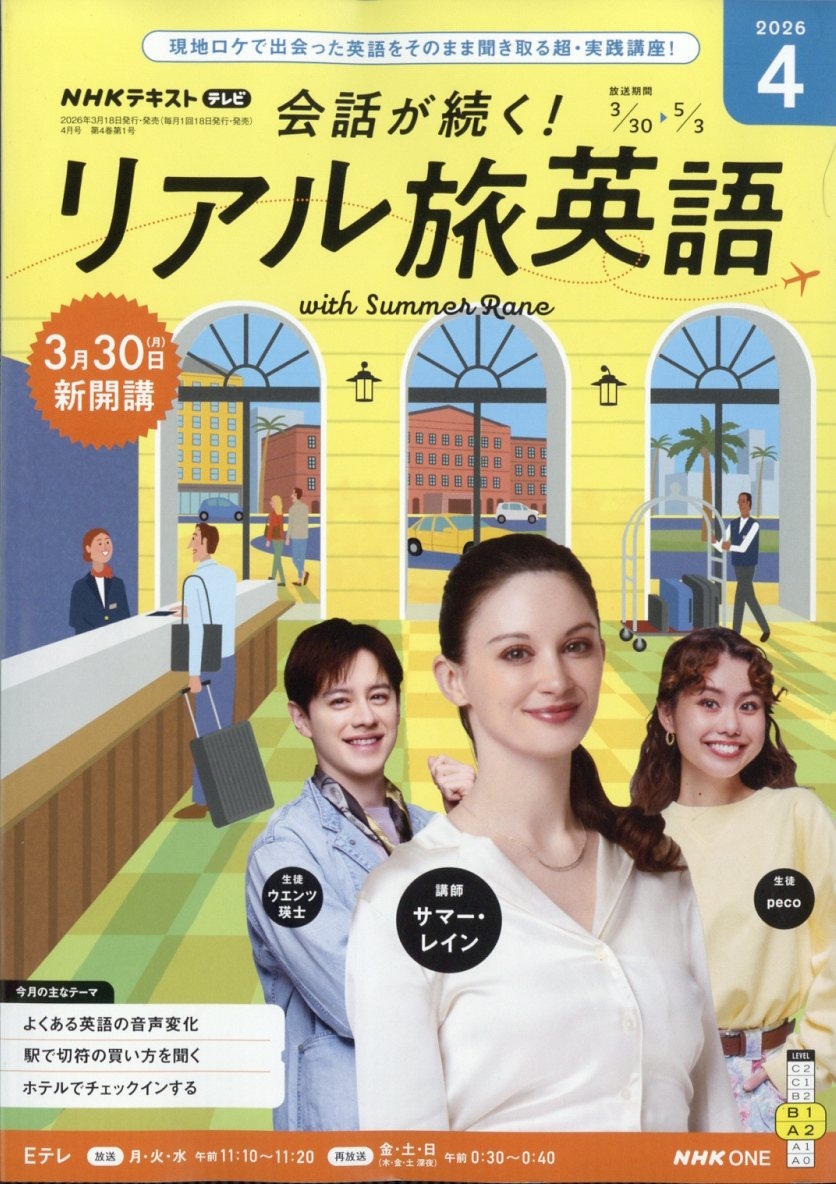 発売日:2026年03月18日/商品ID:7985132/ジャンル:DOMESTIC MAGAZINE/フォーマット:Magazine/構成数:1/レーベル:NHK出版/タイトル:TV会話が続く!リアル旅英語 2026年 04月号 [雑誌]/タイトルカナ:テレビカイワガツヅクリアルタビエイゴ