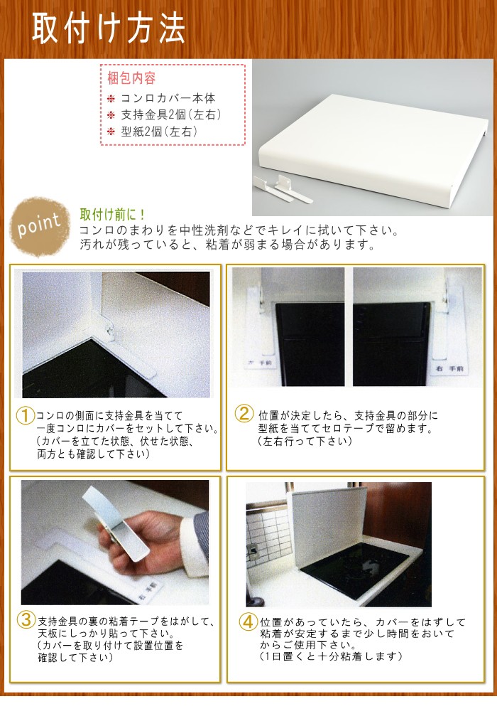 ・部品明細:コンロカバー本体1個 支持金具2個(左右) 型紙2個(左右)