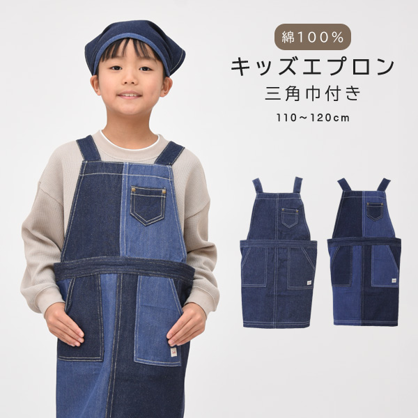 キッズエプロン デニムボックス 三角巾 セット Mサイズ 男の子 女の子 男女兼用