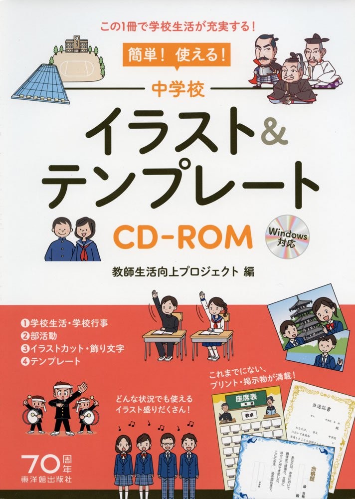 第1章 学校生活・学校行事 (1)入学式・新学期/(2)時間割/(3)学校生活/(4)遠足・修学旅行 (5)夏休み/(6)冬休み/(7)水泳/(8)体育祭・文化祭・合唱コンクール (9)生徒会活動・委員会活動/(10)ポスター/(11)卒業式第2章 部活動 (1)野球部・ソフトボール部・サッカー部 (2)バスケットボール部・バレーボール部・水泳部 (3)陸上部・ダンス部・テニス部・登山部 (4)ラグビー部・ハンドボール部・卓球部・バドミントン部・ゴルフ部 (5)柔道部・剣道部・相撲部・空手部・弓道部 (6)吹奏楽部・応援部・茶道部・華道部・書道部 (7)将棋部・コンピュータ部・囲碁部・放送部 (8)演劇部・美術部・写真部・部員名簿第3章 イラストカット・飾り文字 (1)生徒/(2)先生・働く人々/(3)学習イラスト/(4)季節:春・夏 (5)季節:秋・冬/(6)世界の国々キャラ/(7)歴史人物キャラ1 (8)歴史人物キャラ2/(9)学校・もの関係イラスト/(10)メッセージカード (11)飾り文字1/(12)飾り文字2/(13)飾り罫/(14)飾り囲み/(15)吹き出し第4章 テンプレート (1)学級づくり/(2)新聞係・委員会カード・学習計画/(3)座席表/(4)時間割 (5)賞状1/(6)賞状2/(7)職業体験・進路指導/(8)テスト関連カード (9)読書カード・生徒会選挙カード/(10)国語・数学/(11)社会・理科 (12)美術・音楽・技術家庭/(13)保健体育/(14)英語・総合的な学習の時間