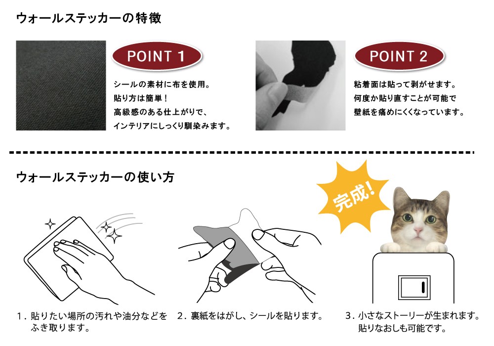 電気のスイッチまわり、棚の上、トイレの壁など毎日何気なく見ている場所にストーリーを生み出すことができるウォールステッカーです。