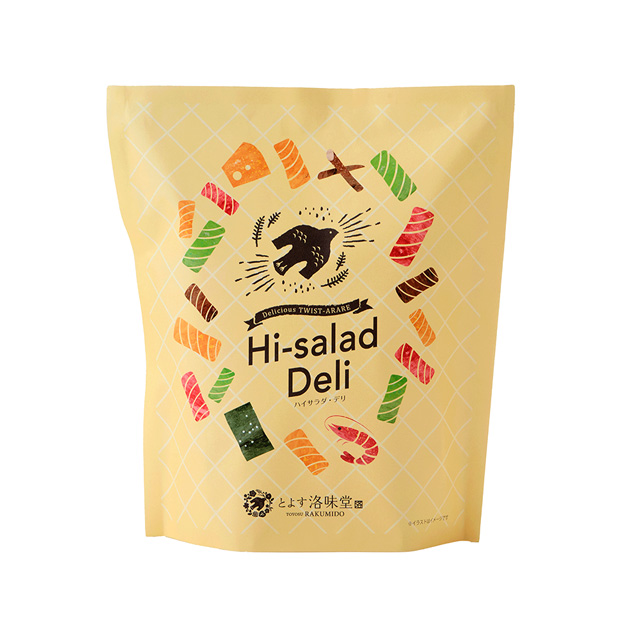パッケージは、ハイサラダを模したデザインの中に素材のイラストが紛れ込み、にぎやかな遊び心をくすぐるデザインです。