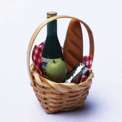 かごにワインとフランスパン、青りんご、銀のコップがセットになってます!