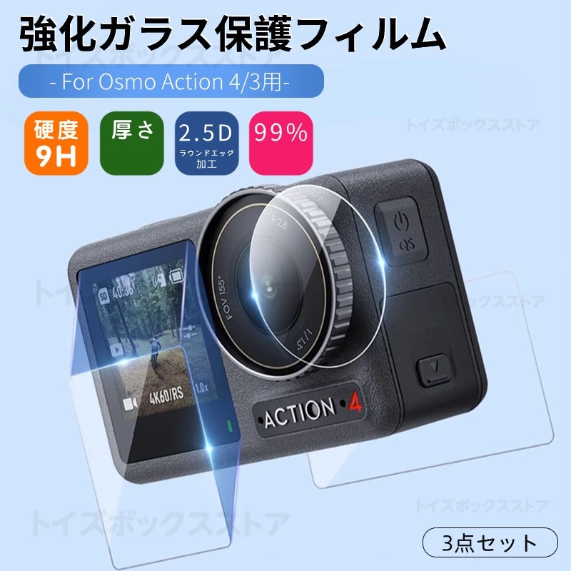 3点入 DJI Osmo Action 5 Pro用強化ガラス保護フィルム Osmo Action 4 Action 3用強化ガラス保護フィルムシール 表面硬度9H レンズ部+前方+後方 衝撃吸収に抜群
