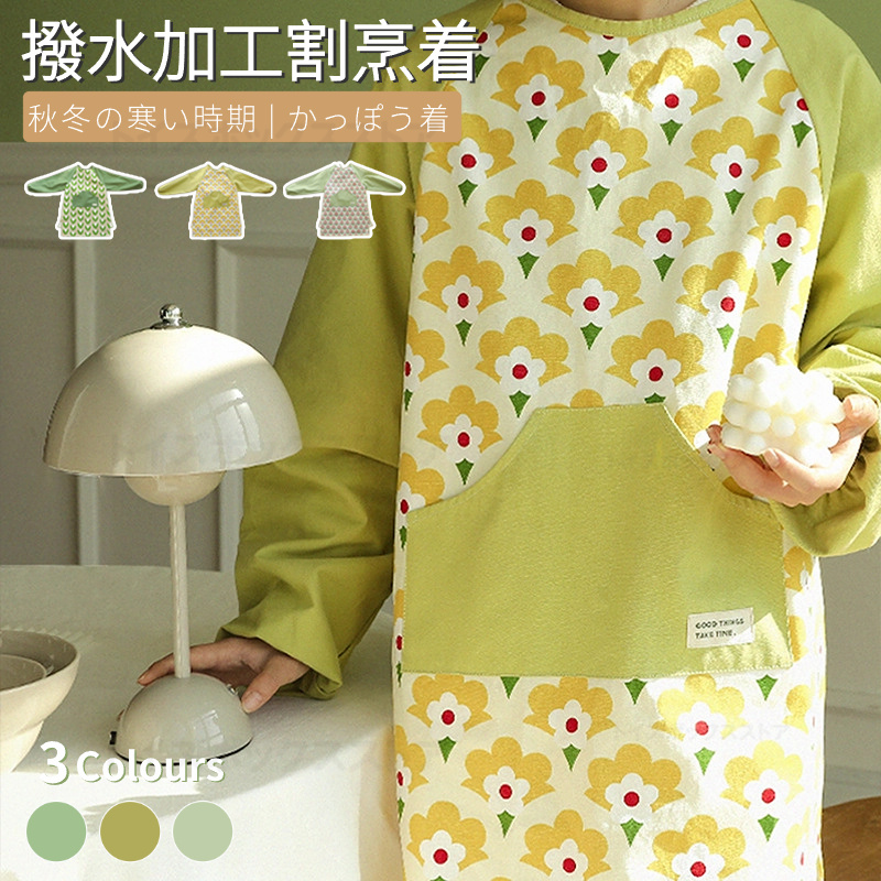 程よく厚みのある丈夫な綿生地で、生地には撥水加工を施しており、料理や洗い物での汚れ水跳ねからお洋服をしっかりと守ります。