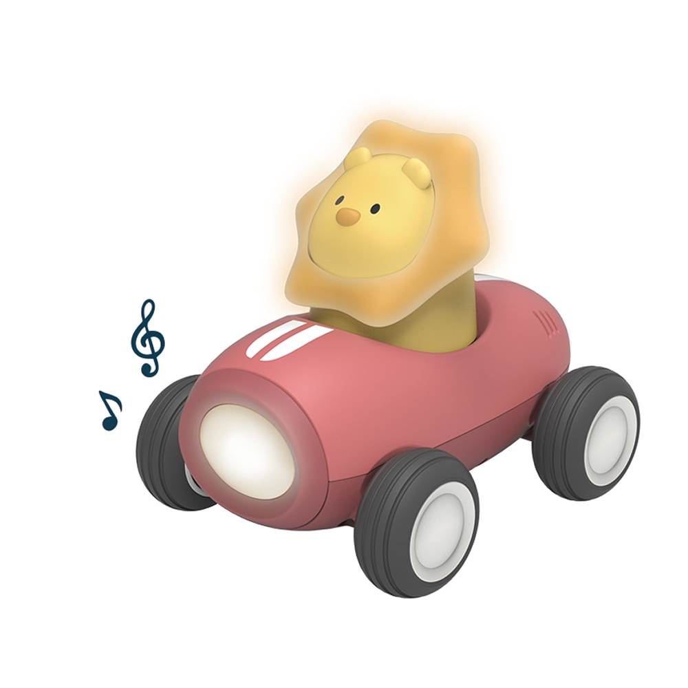 『PLAY POP(プレイポップ)』は、小さいお子様から大人の方まで、幅広く楽しんでいただける、世界中のパーティーゲームやボードゲームが揃った、トイザらスのプライベートブランドです。かわいいライオンのレーサーが乗ったフリクションカーボタンを押すと光って音楽が流れるよ