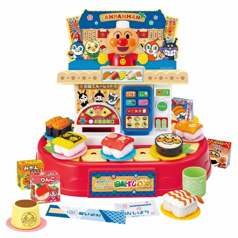 本体、回転レーン、天板、たなパーツ、アンパンマンレリーフ、背板(紙製)、まぐろ、サーモン、たまご、いくら、えび、太巻き、プリン、お皿×8枚、湯のみ、ジュース(紙製)×2個、ポップ(紙製)×2枚
