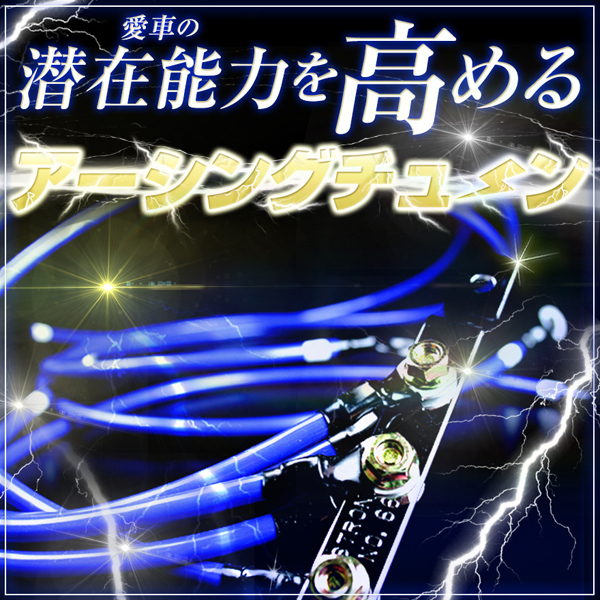 ケーブルはアーシング専用で耐熱性の高いケーブルを使用し、8sqのケーブルで色はブルーです。端子には高純度体を使用しました。各車種(エンジン)用設計です。