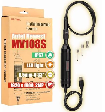 説明: Autel MaxiVideo MV108S デジタル検査カメラ 2024年アップグレード MV108/MV105S IP67 防水 8.5mm ボアスコープ 39.37インチ 2MPカメラ + LEDライト 1920x1080 Autelスキャナー&PC対応
