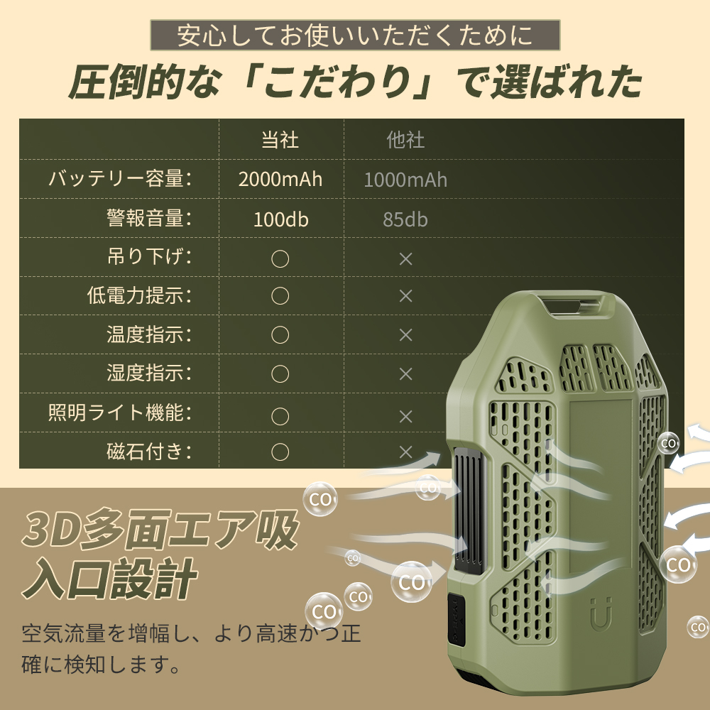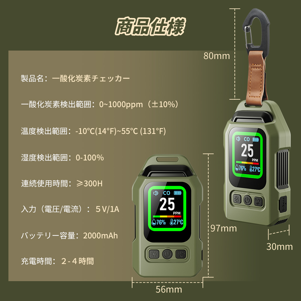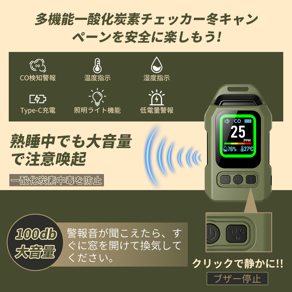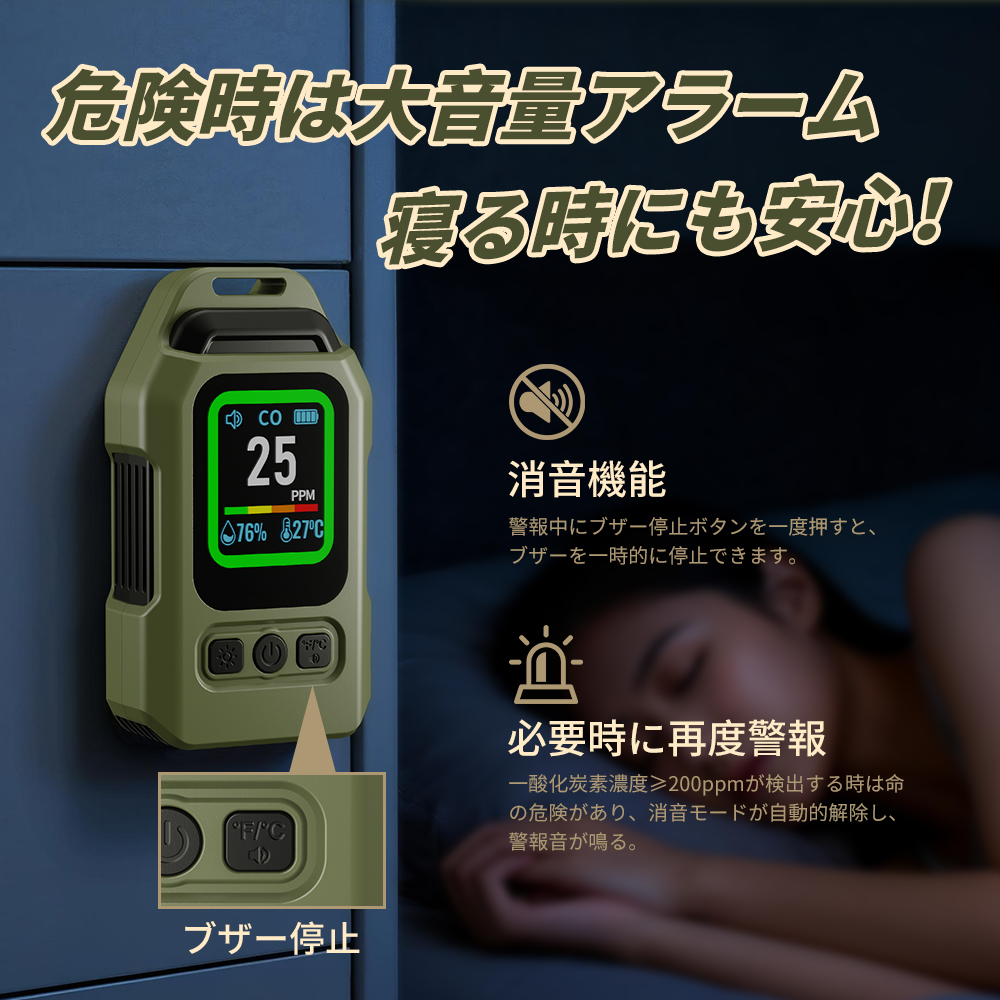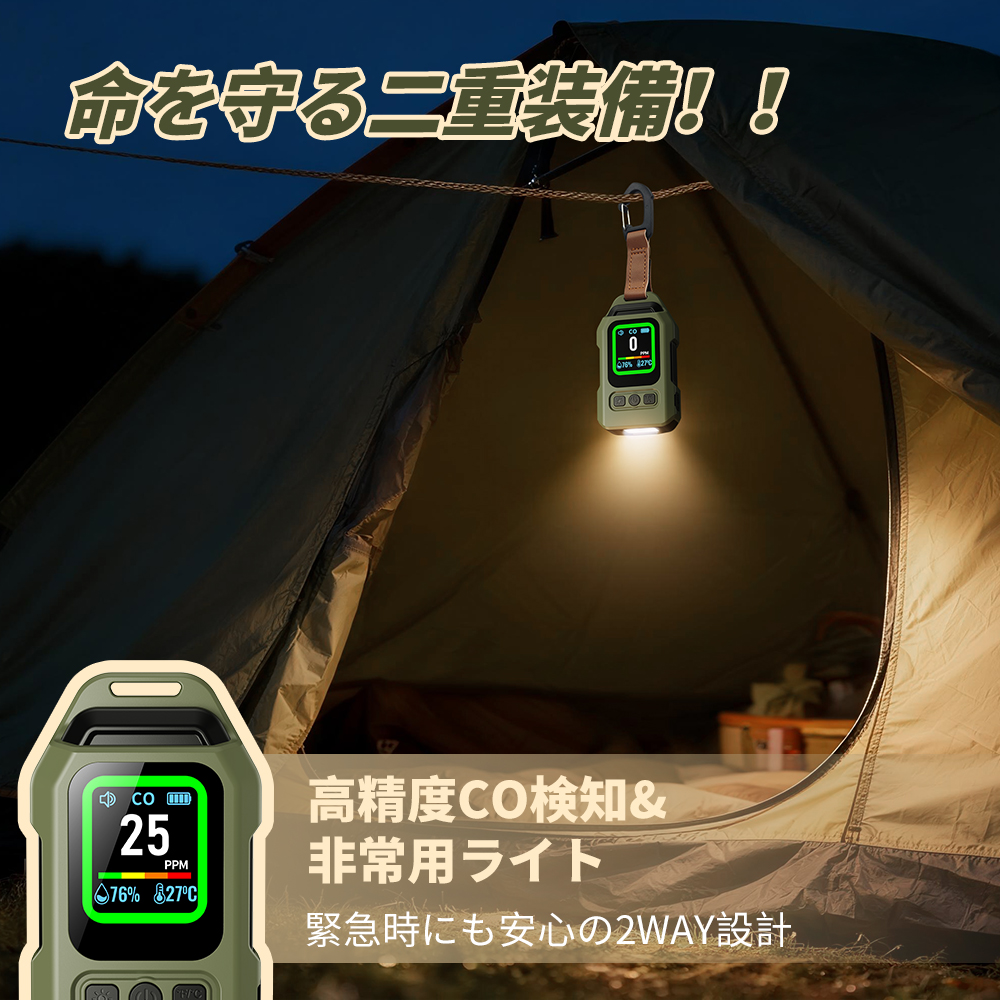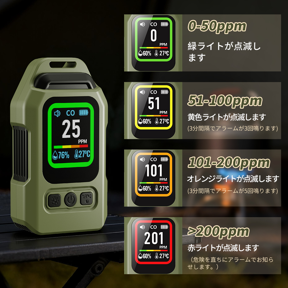 一酸化炭素 高精度CO検出器 携帯型 一酸化炭素チェッカー センサー搭載 一酸化炭素警報器 充電式 2000mAhバッテリー 磁石付き 濃/温/湿度 音声アラーム・LEDライト付き キャンプ用 チェッカー CO検知器 防水IP65 最大300h連続作動 測定器 警報機 ポータブル 長寿命 耐久性 小型 低電力 室内 家庭用 旅行用 車中泊 防災グッズ 日本語説明書付き