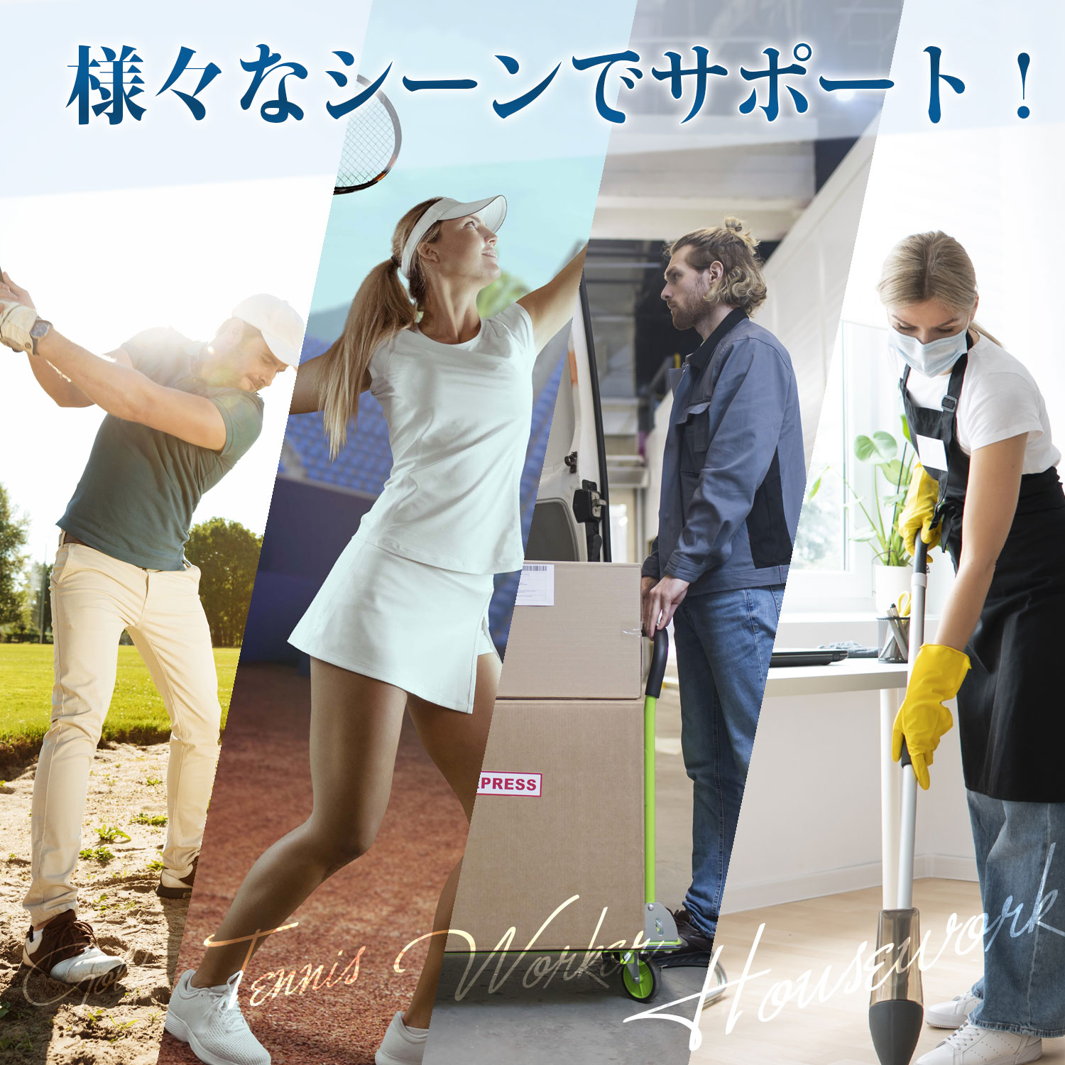 肘にかかる衝撃を和らげ、装着・調整もしやすく、長時間の使用でも快適にご使用できるよう設計しました。日常生活の制約や介護や腱鞘炎、テニス、ゴルフ、バレーボール、野球、筋トレなどスポーツ活動の障害から解放することにコミットしました。