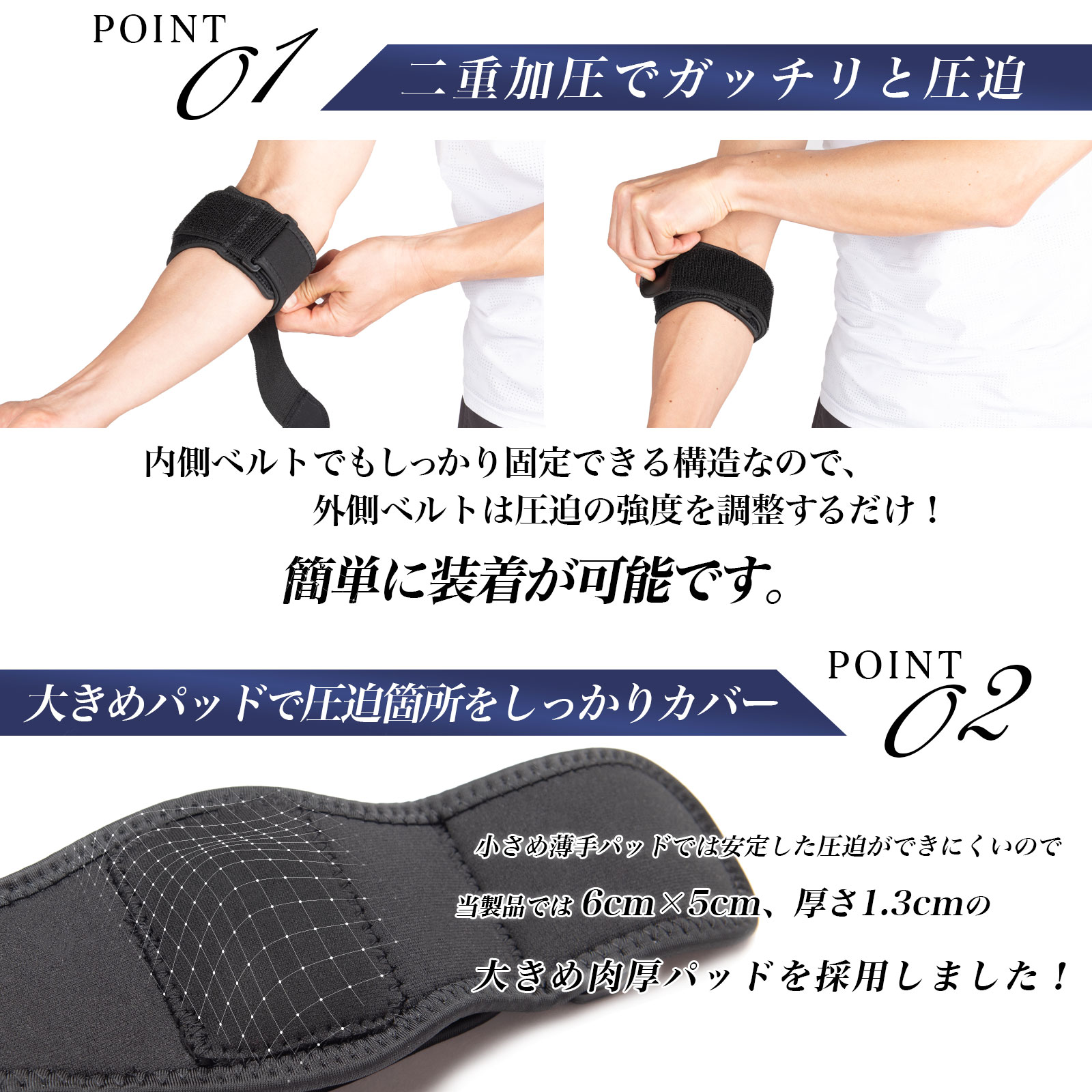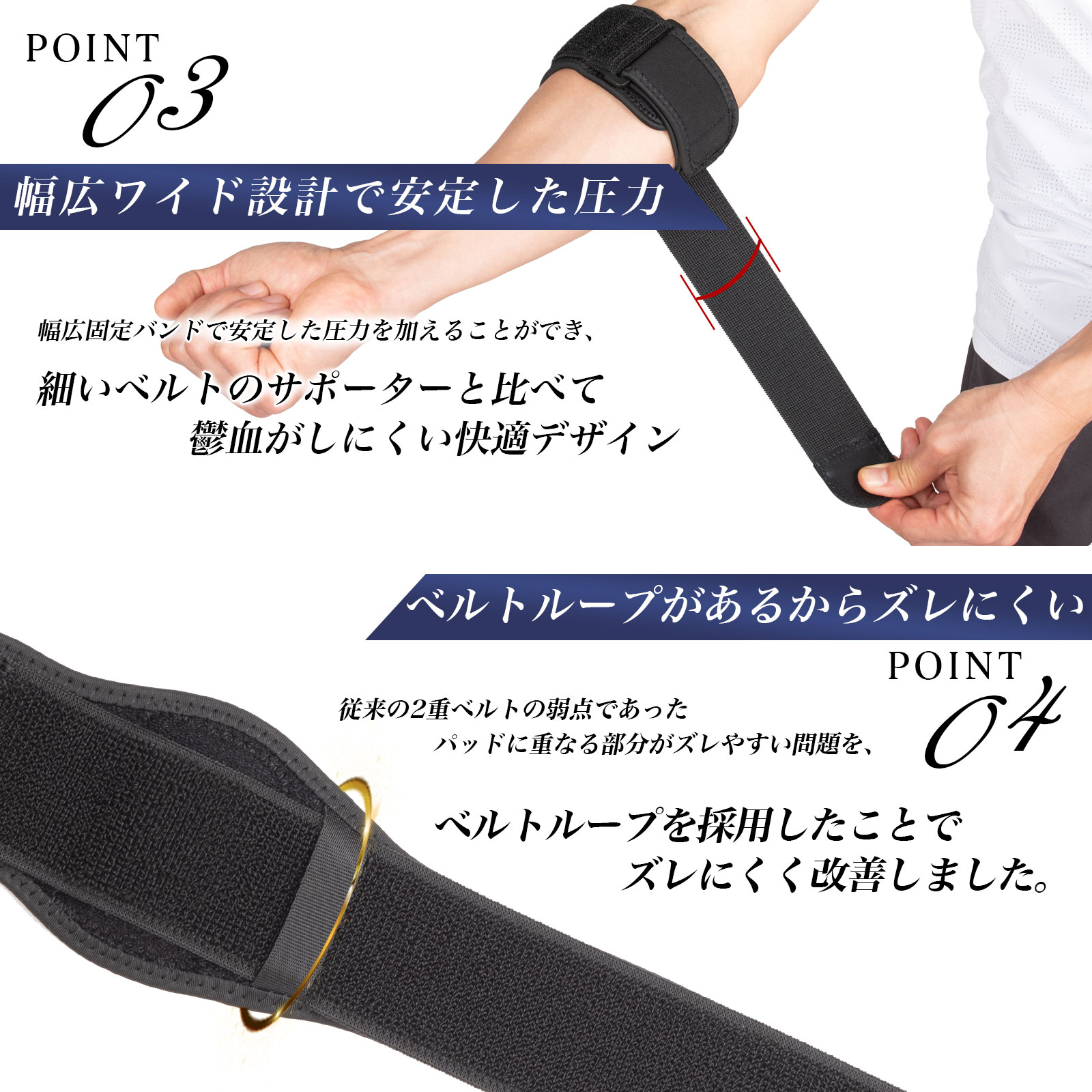 現役院長から監修推薦された肘 装具です。2段階Wベルト設計、幅広バンド、ホールド力強化、快適性追求など、様々な設計要素が取り入れられています。