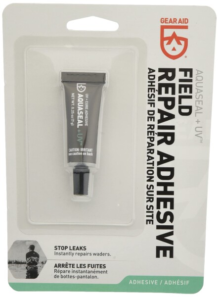 ギアエイドはアウトドアウェアや道具を修理、お手入れするメンテナンス用品の専門ブランドです。アクアシール+UVは、太陽光線や紫外線に当ることで硬化する補修剤です。ウェダーや防水バッグのピンポールにおすすめ。日陰で作業をした後に太陽光線に当ててください。紫外線に当てると1分程で硬化します。