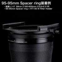フィルター枠径95mmのレンズに対応し、フィルター取付位置を延長するフィルター用の継ぎ手。レンズ鏡筒を保護するためにレンズ先端にゴムを装着した超望遠レンズなどでのフィルターの操作性を高めます。また、取付位置が延長されていることで、フィルター着脱時にもスムースな操作が可能です。HT100-95mm Adapter ringを使用してHT100 III Filter Holderを装着する際に、スペーサーリングにより空間の余裕が生まれるため、フィルター枠径95mmのレンズでの100mm幅角型フィルターのフィルターワークも向上します。