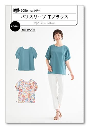 ■プランニング 型紙 パターン パフスリーブTブラウス 6056切り取ってそのまま使える実物大型紙と説明書がついています。身頃続きのパフスリーブ2種デザイン。Aは袖に4本のタックがあり、袖口の太めのカフスがアクセント。Bは袖にタックがなく、カフスにゴムを通したギャザーデザイン。簡単仕立てながら小技のきいたプルオーバータイプのブラウスです。袖丈は少し長め、身幅はやや広めで、風が通る涼しげなゆとり。1枚で着ても気になる二の腕や体型をカバーする、夏にぴったりなアイテムです。3サイズ縫いしろつきパターン