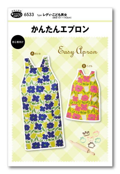■プランニング 型紙 パターン かんたんエプロン 6533切り取ってそのまま使える実物大型紙と説明書がついています。タイプ:レディ(身長148-168cm、ヒップ84-102cm) / こども男女(身長101-143cm)おとな用とこども用の簡単仕立てのエプロンが作れるロングラン商品。おとな用は後ろひも結びで、肩ひもの長さが2 段階にボタン調節できるタイプ。 こども用は後ろ身頃が交差しているかぶりタイプなので、ひとりでも簡単に着られます。入園入学の準備に、また、お子様やお孫様等とご家族お揃いや、プレゼントにも最適です。 適した布地:中肉からやや厚手の布地 (オックス/ ソフトデニム/ ダンガリー/ シャークスキン/ カツラギ/ カラーシーチング)