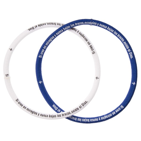 サッカー、フットサルシーンで使われる、「Pulsera=プルセラ」と呼ばれている髪止めにもなるブレスレットです。書かれている文字は、勝利への祈りの言葉[Si cree en miraglos y nunca bajas los brazos、existe el Dios.]「奇跡を信じ、絶対あきらめなければ神はいる。」です。