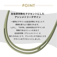 “非対称”に宿るチカラをデザインに 無駄のない細いラインにBANDELのデザインの特徴であるスリットをあえて左右非対称に取り入れました。シンプルでありながらも、気持ちの良いアンバランス感、変化や流れを感じさせることをデザインのアクセントに。心を落ち着かせる柔和な色合いのナチュラルなニュアンスカラーを採用しました。 BANDELシリコーンアクセサリーの魅力 特殊な微細振動加工による調合 創業以来、身につける人の「バランス力・運動能力・回復力・集中力」を引き出す特殊な加工技術である微細振動を加工した製品として、プロアスリートをはじめ身体的なパフォーマンス向上を追い求める多くの人々に選ばれ続けています。 特別なプラチナシリコーン素材 ASYM は有機過酸化物を使用しない極めて安全なプラチナシリコーンをベースに、天然鉱石の一種である石英(クォーツ)と純金が微量に調合し、微細振動の効果を最大限に発生させるための特別なシリコーン素材によって生産されています。 | ||
