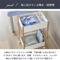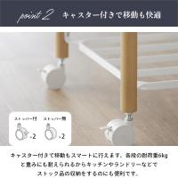 | 材質 | 棚:スチール(粉体塗装) 支柱:天然木(ウレタン樹脂塗装) バスケット・小物トレー:ABS樹脂 キャスター:ナイロン | |