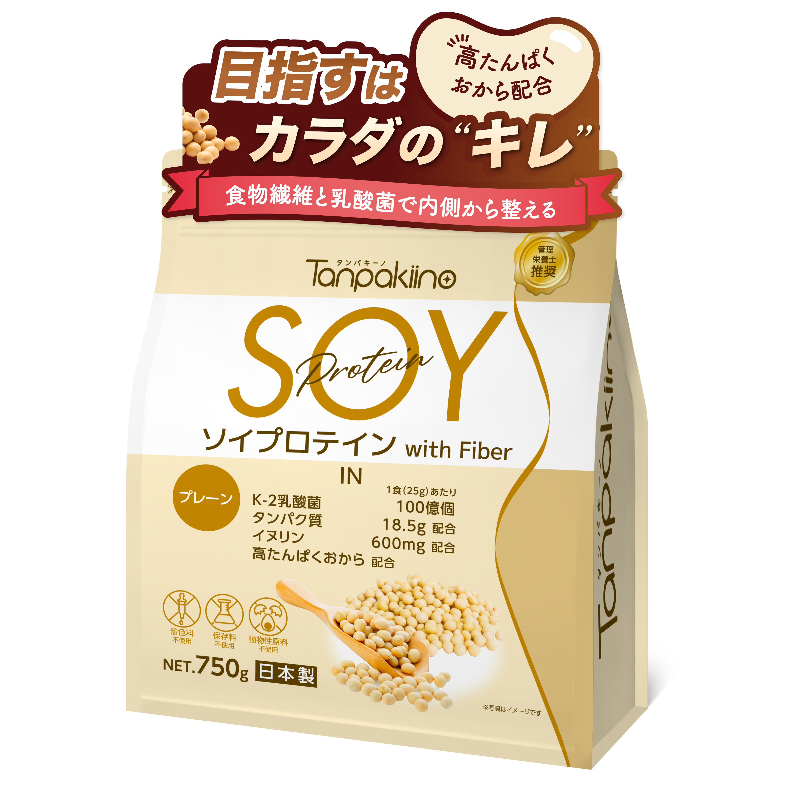 タンパキーノ ソイプロテイン(プレーン) 送料無料 750g 国内製造 管理栄養士推奨 グルテンフリー おから イヌリン 食物繊維 乳酸菌100億 高たんぱく