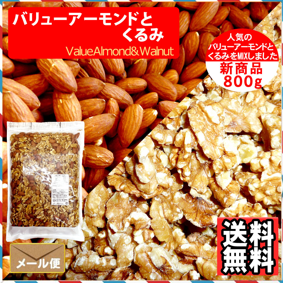 2種類のミックスナッツ バリュー品 素焼き アーモンドと くるみ 800g販売開始