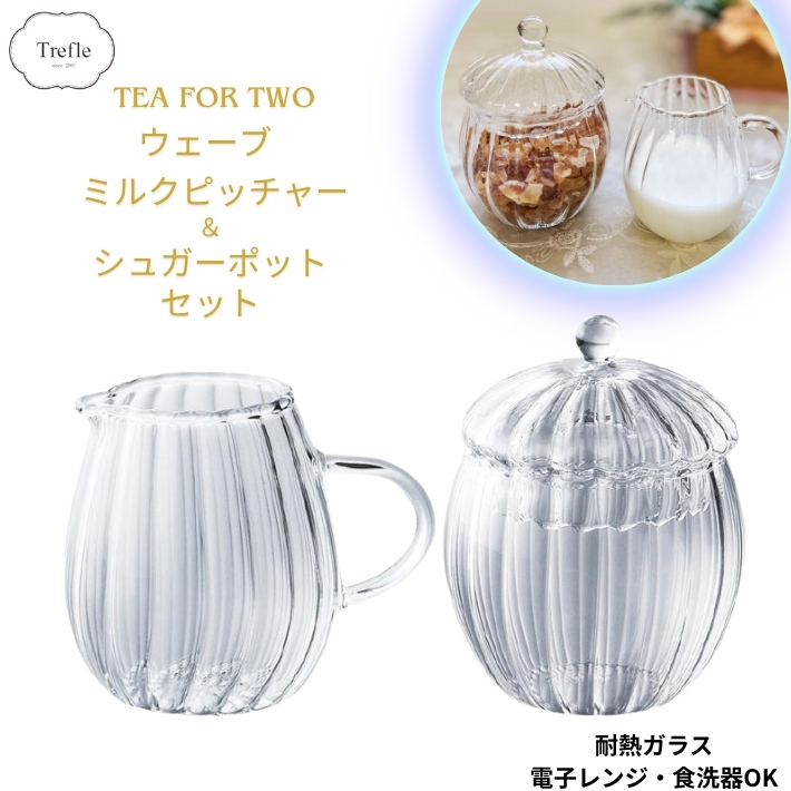 ウェーブ ミルクピッチャー & シュガーポットセット ガラス 耐熱ガラス クリア 透明 砂糖 牛乳 コーヒー 紅茶 ティータイム