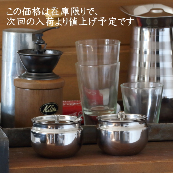 無駄のないフォルム インド製のステンレスシュガーポット、無駄のないシンプルなデザインです スプーンもセットで付いています ステンレスは汚れがつきにくい特徴があるのでキッチン用品に広く使われる素材です 昔ながらの喫茶店にあるようなレトロな感じもあり、モダンな雰囲気も兼ね備えたシュガーポット どんなテーブルウェアにも馴染んでくれます |