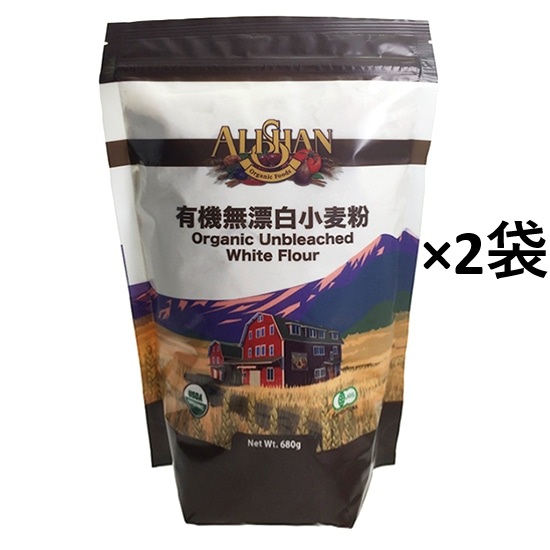 栄養素がより多い。アリサン G133 有機無漂白小麦粉 680g×2袋。やや濃い色で、やや濃厚な食感。