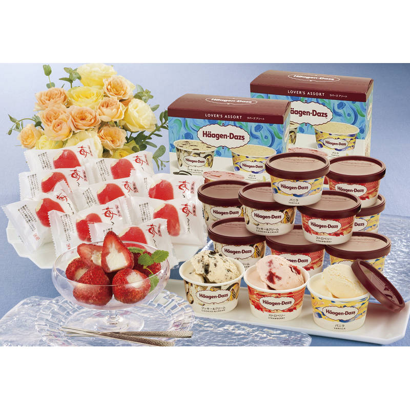 甘酸っぱい苺の中に練乳入りアイスを詰め込んだ苺アイスとハーゲンダッツで人気のフレーバー3種類が入った“ラバーズアソート”をセットにしてお届けいたします。