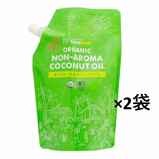 ココウェル 香りのない有機プレミアムココナッツオイル 460g(500ml)×2袋。ラウリン酸。BPAフリーのパッケージ。