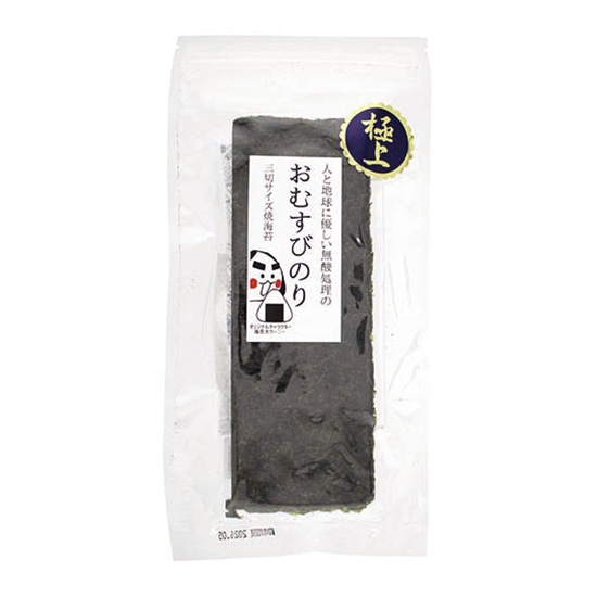 愛知県西三河産の口の中で抜群のうまみ・香りが広がる海苔です。 環境にやさしい無酸処理の焼き海苔をおむすびにぴったりのサイズにカットしました。海苔屋筋では全国的に評価の高い愛知海苔ですが、その中の西三河産の海苔は口の中で抜群のうまみ・香りが広がります。 おむすびのりは、乾海苔を焼き上げた後、全型の3分の1サイズにカットしています。※酸処理は主に病気予防のためにクエン酸などが含まれた酸処理剤につける作業です。 この生態系に影響を与えるかもしれない酸処理がされていない環境にやさしい海苔です。愛知県西三河産、抜群のうまみと香り環境にやさしい無酸処理焼き海苔をおむすびにぴったりのサイズ(全型の3分の1)にカット焼いてある手軽さが魅力召し上がり方・ご使用方法おむすび(おにぎり)にまいて。召し上がりください。海苔をしっかり味わって頂けるシンプルな塩むすびがオススメ。手巻き寿司、手巻きごはん、お餅、海苔トーストなど、ご飯のお供や様々なおかずに巻いて頂けます。メーカー:戸田理平商店江戸末期に始まった愛知の海苔養殖。伊勢湾・三河湾の広大な浅海干潟を活かして県下の沿岸域に広がり、 現在は知多、西三河、東三河の3エリアで生産しています。 その中でも西三河産の海苔は、矢作川から三河湾へ流れ込む栄養と陽光に恵まれて味の評価が高く、贈答用に好まれます。さらに特筆すべきことに、西三河の海苔養殖は基本的に酸処理をしないのです。 西三河は、海の中に支柱を立てて浅く網を張る昔ながらの「支柱式」。 1日2回の干潮時には海中から海苔が顔を出し、太陽の光をたっぷり浴びます。大変手間がかかりますが、うまみのある海苔が育ちます。 さらに日光を浴びるおかげで病気が出にくく、酸処理せずに済むのです。「人と地球に優しい海苔屋」を目指す戸田理平商店は、この貴重な西三河産の無酸処理海苔を積極的に仕入れて加工しています。栄養成分表示全型1枚3g当たり/エネルギー 9kcal/タンパク質 1.2g/脂質 0.1g/炭水化物 1.3g/食塩相当量 0.04g原材料名 乾海苔(愛知産)内容量 3切り15枚賞味期限 (製造日より)300日