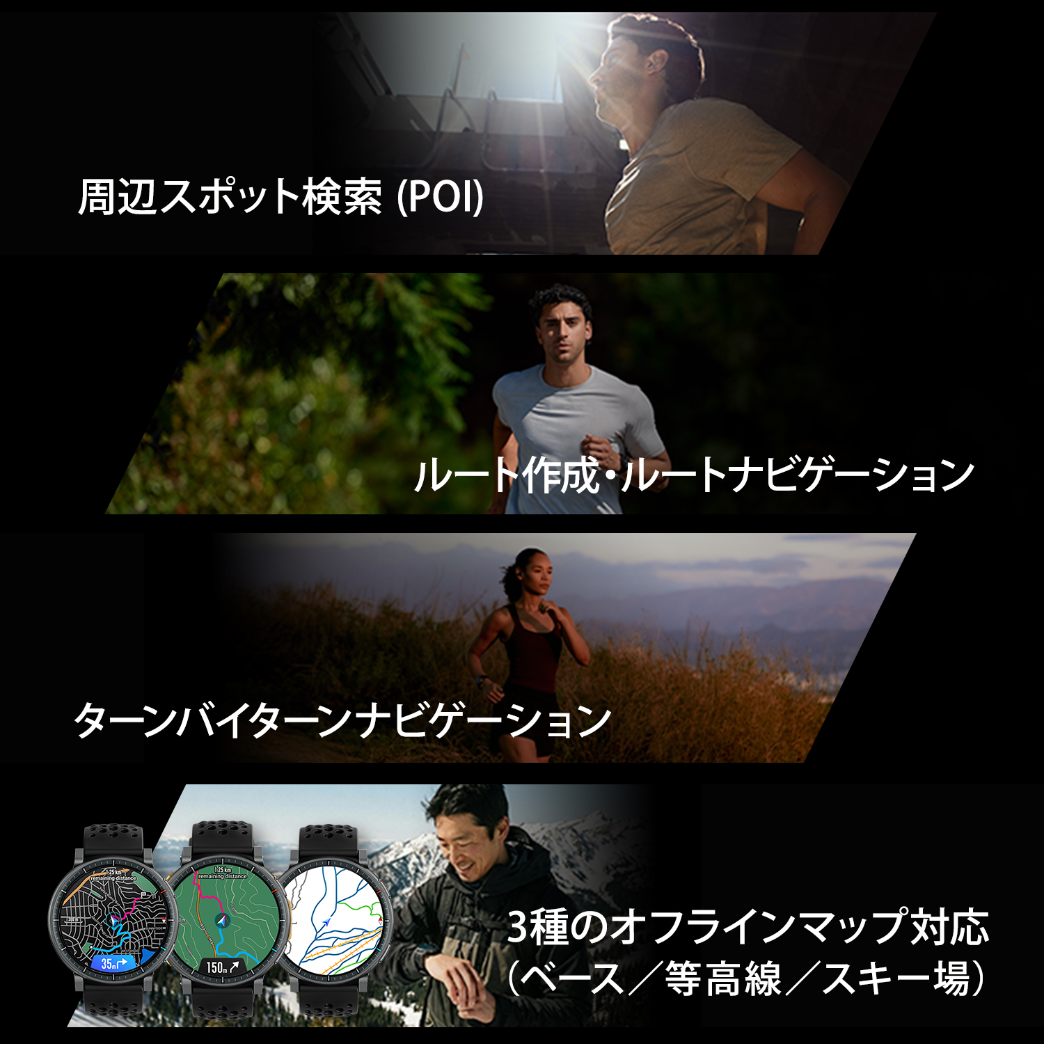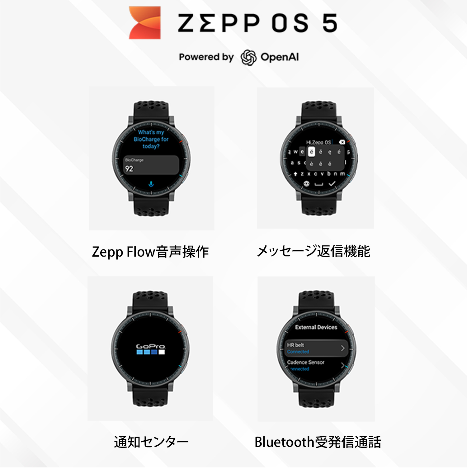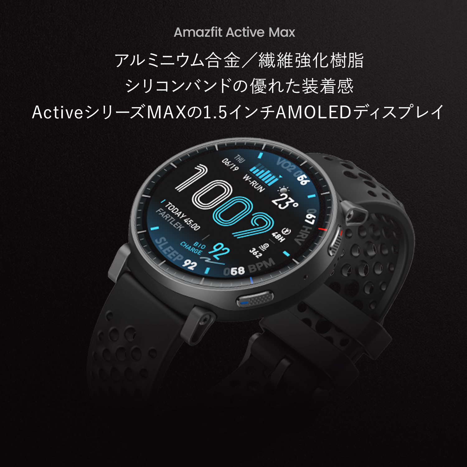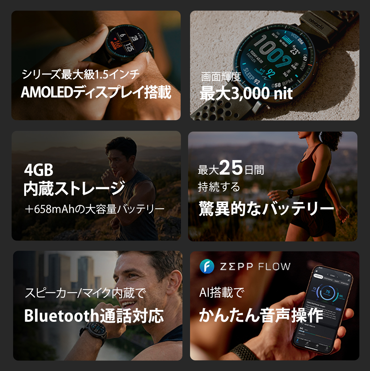 | 1. LEDディスプレイMAX! ActiveシリーズでMAXの1.5インチAMOLEDディスプレイ 2. 視認性MAX! 画面輝度も最大の3,000nitで視認性もMAX 3. バッテリー性能MAX! 価格帯MAX級のバッテリー性能(最大25日間持続) 4. ストレージ容量MAX! 価格帯MAX級のストレージ容量(4GB)でMAP機能も充実 5. 使いやすさMAX! AI技術導入(音声操作Zepp Flow、食事管理機能Zepp App Food Log) |