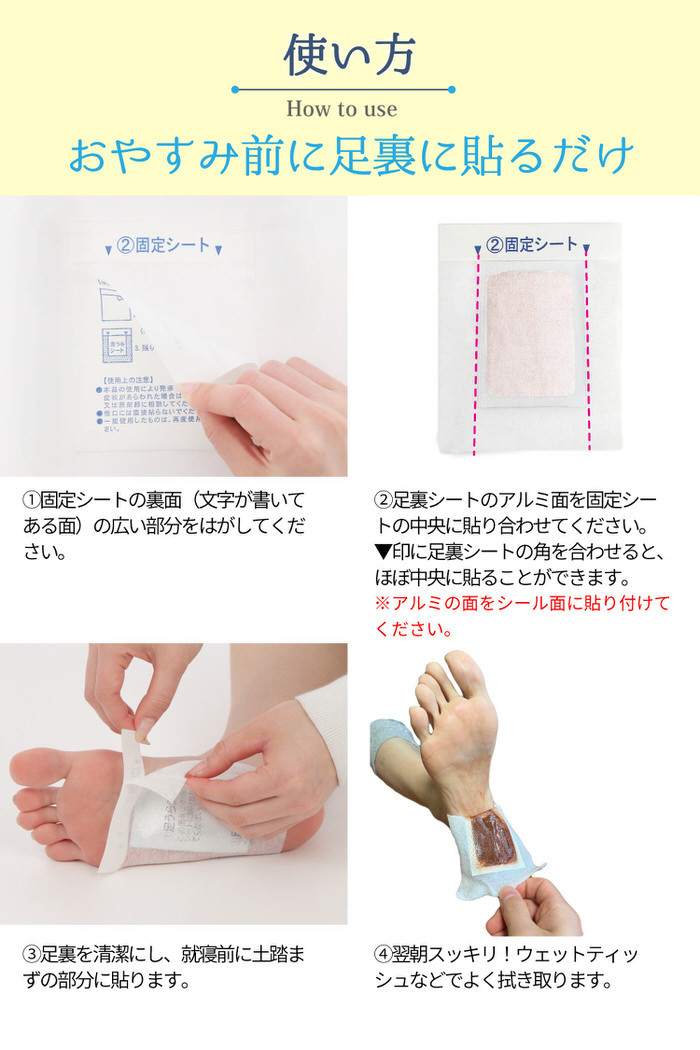 ?足裏を清潔にし、就寝前に土踏まずの部分に貼ります。