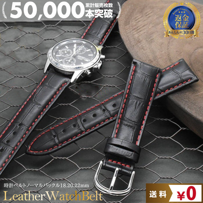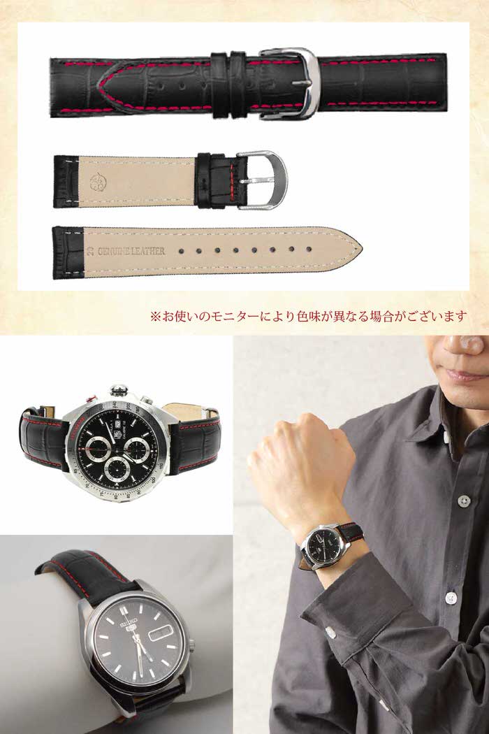 革ベルト empt 黒 赤ステッチ ブラック レッド クロコ 黒 赤 18mm 20mm 22mm 替えベルト 変え ベルト 替えバンド