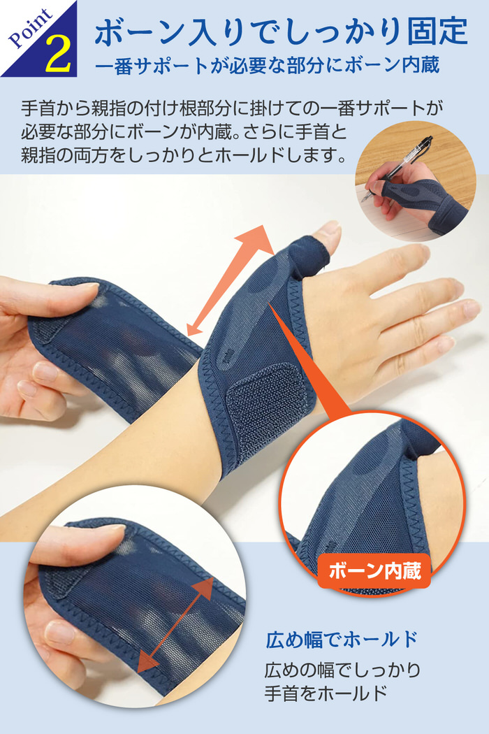 手首から親指の付け根部分に掛けての一番サポートが必要な部分にボーンが内蔵。メッシュ素材の幅のあるサポーターを巻くことにより、さらに手首と親指の両方をしっかりとホールドします