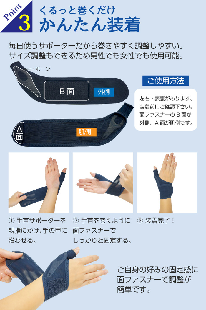 ご自身の好みの固定感に面ファスナーで調整が簡単です。サイズ調整もできるため男性でも女性でも使用可能
