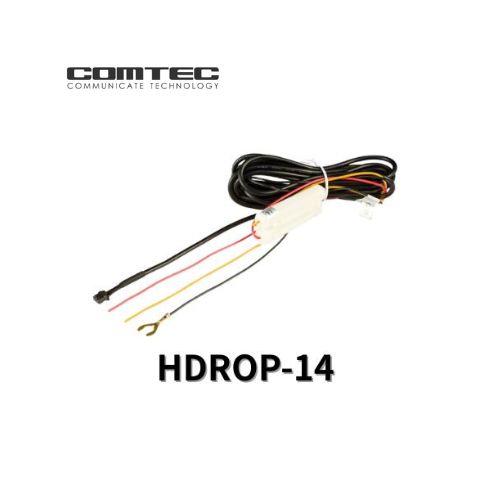 HDROP-14は、駐車監視機能付きドライブレコーダーに電源を直接配線できる、コムテック純正の駐車監視コードです。車両キースイッチOFF後も電源を供給し、録画を継続できる安心設計のオプションパーツです。