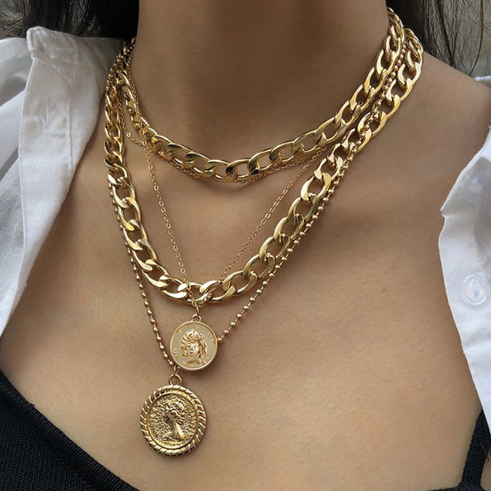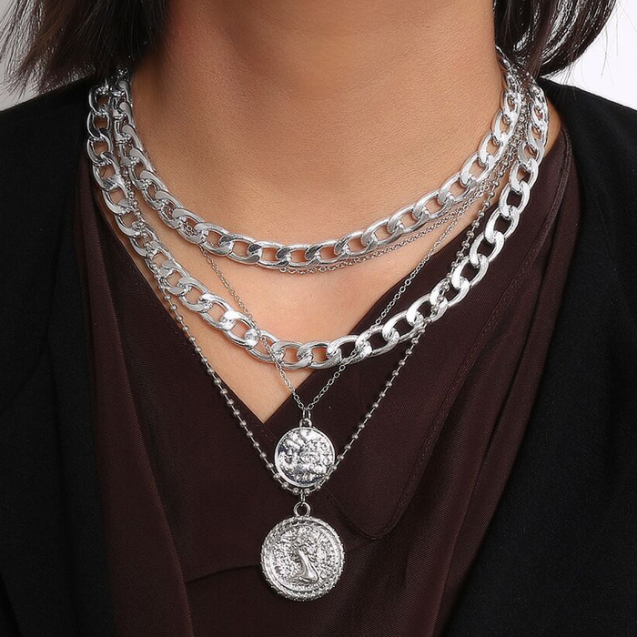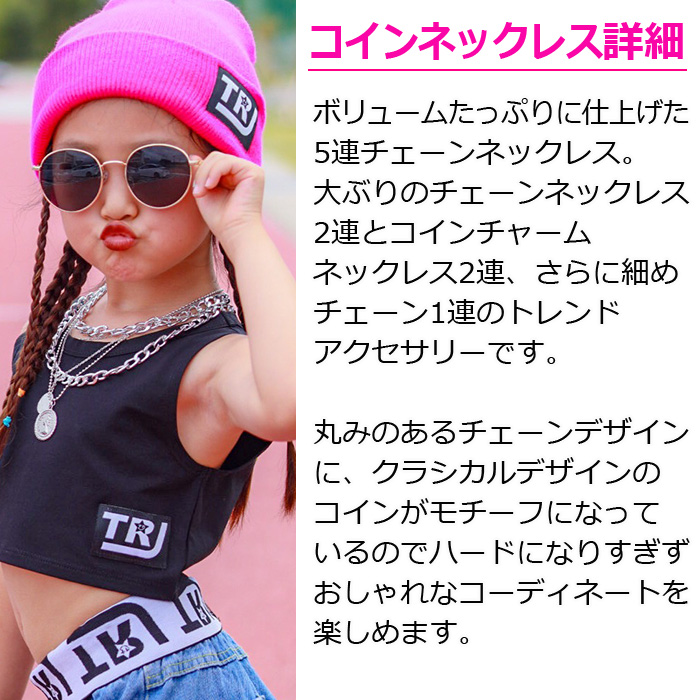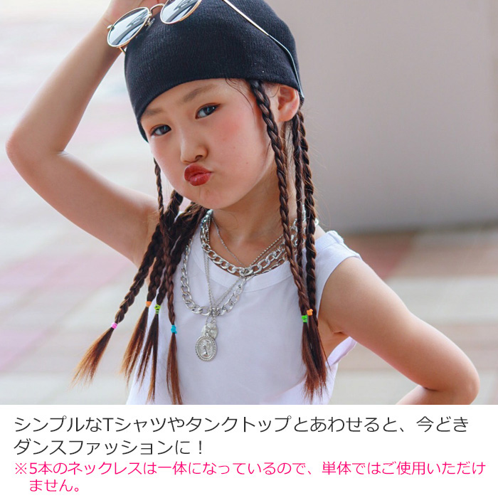 ダンスで映える小物コーデセット! おしゃれダンサー必見!当店大人気の小物だけをセットにしました。 5連ネックレスとヘアリング35個セットの2種セットになります。ボリュームたっぷりに仕上げた5連チェーンネックレス。 大ぶりのチェーンネックレス2連とコインチャームネックレス2連、さらに細めチェーン1連のトレンドアクセサリーです。 丸みのあるチェーンデザインに、クラシカルデザインのコインがモチーフになっているのでハードになりすぎずおしゃれなコーディネートを楽しめます。