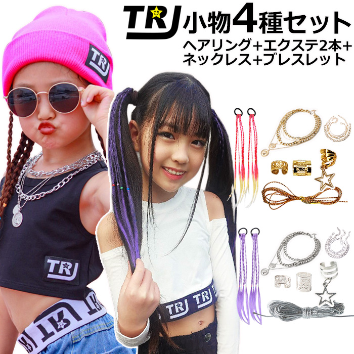 送料無料 ダンスコーデ 4種セット 5連ネックレス+3連ブレスレット+ヘアリング36個セット+エクステ2本 ブレイズビーズ 女の子 キッズ 子供用 ゴールド シルバー