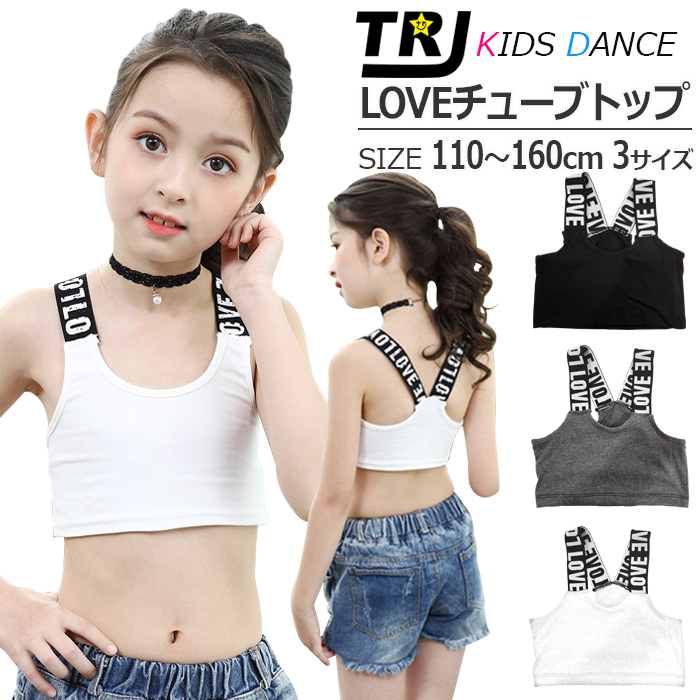 【訳あり】在庫限り チューブトップ パットなし ショート丈 女の子 子供服 LOVE 肩ひもロゴ コットン 無地 110cm〜160cm ジュニア ダンス衣装 ヒップホップ