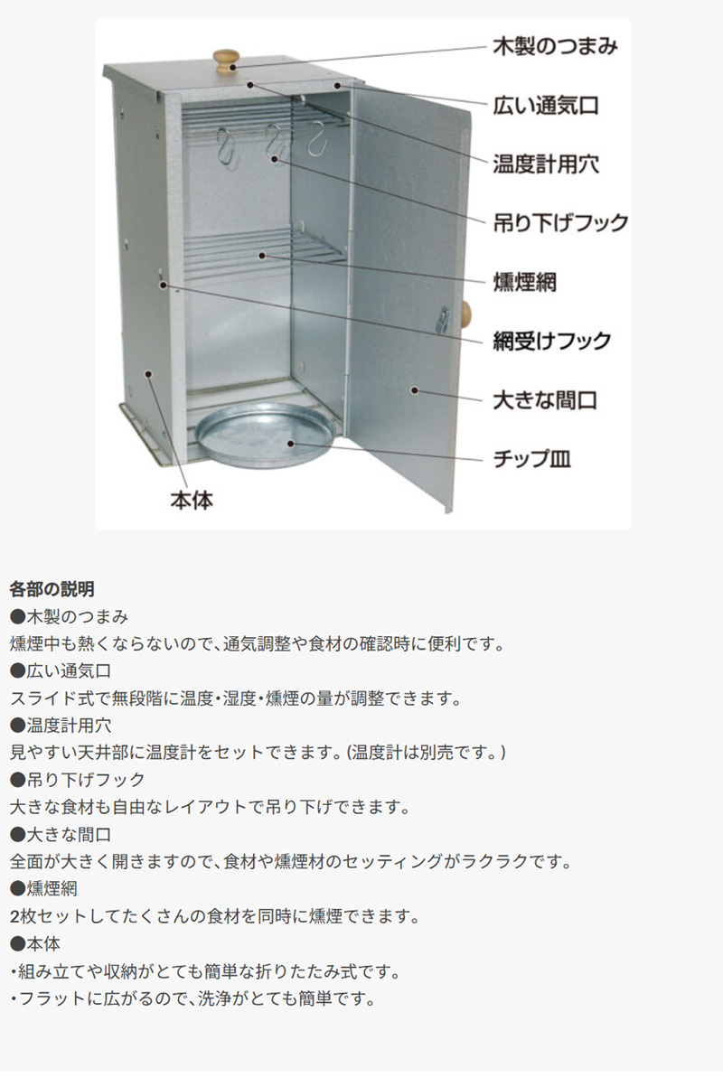 セット内容:本体、フタ、燻煙網(2枚)、チップ皿(1枚)、吊り下げフック(3本)、木製つまみ(2個)