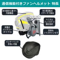 飛来落下物用と墜落時保護用の認証に加えて、トランシーバー(技適マーク認証済み)を搭載し、150mを超える距離で複数人での通話が可能。