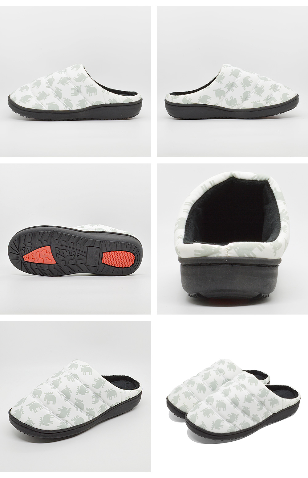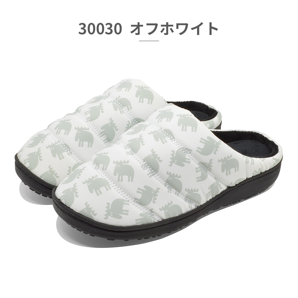 あったかダウン素材にインパクトのあるヘラジカのロゴがワンポイント、高反発のクッションインソールが足にやさしい履き心地のクロッグシューズ。